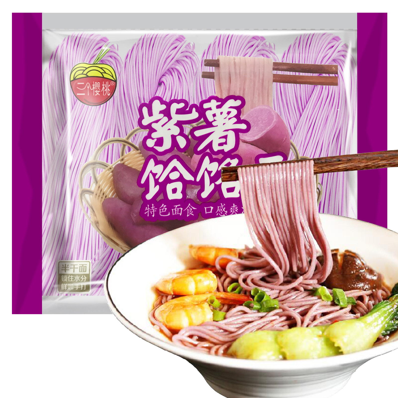 紫薯面中添加紫薯粉,紫薯粉主要是将紫薯晒干之后研磨的粉末,主要丰富的碳水化合物,果胶,膳食纤维,以及少量的粘液蛋白,花青素,还有丰富的维生素C,维生素A,,维生素E,维生素B,不少矿物质元素。